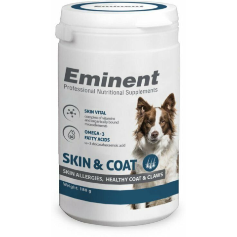 Az Eminent Skin & Coat egy kiemelkedő minőségű táplálékkiegészítő kedvenced bőrének, szőrzetének és karmainak egészségéért. Ideális vedlési időszakban lévő vagy szőrhullással küzdő állatoknak, törékeny, ritkuló szőrzetű kedvenceknek, illetve száraz, hámló bőrrel vagy gyenge, töredező karmokkal rendelkező kutyáknak.Táplálékkiegészítő kisokos kutyáknak és macskáknak: