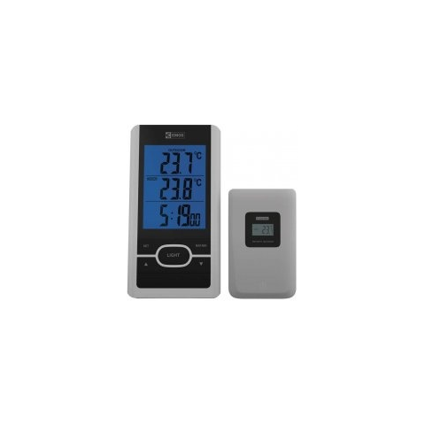 Vezeték nélküli hőmérő kék háttérvilágítású kijelzővel. A hőmérő a mellékelt vezeték nélküli érzékelővel működik, melynek hatótávolsága 60 m. A hőmérő DCF-jellel vezérelt órával rendelkezik. Belső hőmérséklet: -9°C + 50 °C. Külső hőmésréklet: -50°C + 70°C