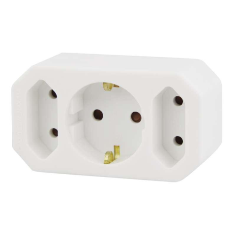 3-as elosztó gyermekvédelemmel. Védettség: IP20 Feszültség/Áram: 250 V~/10 A max. Szín: Fehér Anyag: Műanyag Aljzatok száma: 1× 2P + PE + 2× 2P