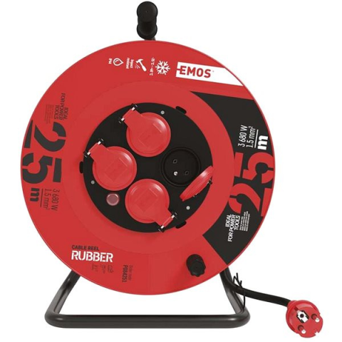 Hosszabbító kábel - hosszúság 25 m, male csatlakozó 1× E/F-típusú dugvilla, female csatlakozó 4× e-típusú dugalj akár 16 A, CYSY, A praktikus Emos dobra tekert hosszabbító kábellel akár 25 méter távolságra is elviheted a villamosenergia-ellátást. A benne lévő H05RR-PVC-F3G vezető keresztmetszete 1,5 mm