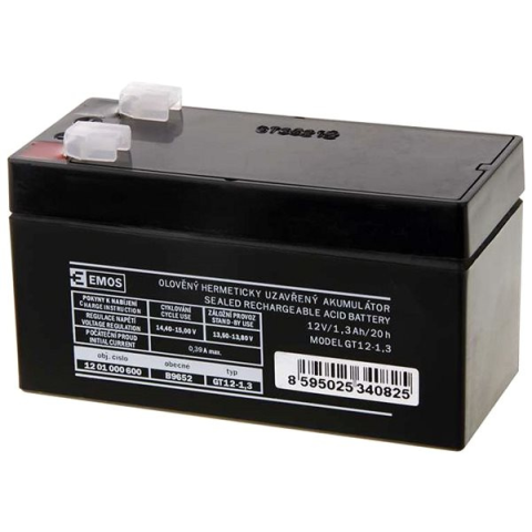 Szünetmentes akkumulátor - újratölthető, 1,3 Ah kapacitás, 12 V feszültség, ólomakkumulátor cella, mérete 5,3 × 9,7 × 4,5 cm (Ma×Sz×Mé) A minőségi EMOS Karbantartásmentes ólomakkumulátor 12 V/1,3 Ah, faston 4,7 mm termék fő jellemzői Az ismert EMOS újratölthető szünetmentes tápegység akkumulátor áramszünet esetén segít Biztosítja kész