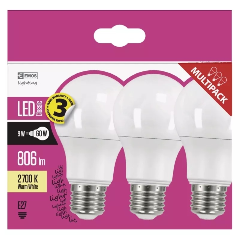 Az EMOS LED fényforrásai magas hatásfokkal, élettartammal és változatos felhasználási lehetőséggel rendelkeznek. A hagyományos izzókhoz képest akár 90%-kal alacsonyabb energiafogyasztás. Klasszikus izzó forma, 60W hagyományos izzónak megfelelő teljesítmény, jó színvisszaadás, 30.000 h élettartam, 25.000 kapcsolási ciklus, meleg fehér színhőmérséklet. Csomag tartalma: 3 db