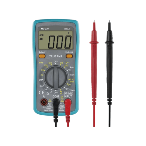 Md-230 multiméter Egyszerű multiméter hobbi célú felhasználásra elektromos berendezések szokásos karbantartásához és új elektromos hálózat kiépítéséhez. A készülék az összes mérőheggyel végezhető mérési alapfunkción túl néhány fejlett mérési funkciót is nyújt. Kényelmes használat A kijelző háttérvilágításának köszönhetően az Md-230 multiméterrel nem fog problémát jelenteni a rossz fényviszonyok mellett végzett munka. Kézi mérési tartomány