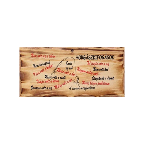 A horgászok gyakran zrikálják egymást vízparton és otthon egyaránt. Így ők nemhogy szeretik, de egyenesen igénylik a jóízű poénokat. Olyanokat, mint a lenti fatábla felirata. Melyek a legjobb, örökérvényű horgászkifogások? Vedd meg ezt a fatáblát és mondd el horgász ismerősödnek általa!