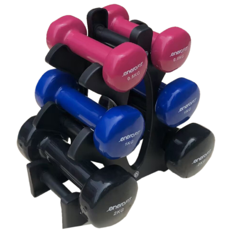 Praktikus ENERO-Fit súlyzó szett összesen 7 kg-os súllyal, kényelmes vinyl borítással és tárolóállvánnyal. Termékjellemzők:• Összsúly: 7 kg• Anyag: vinyl borítás• Szett tartalma:– 1 db állvány– 2 db 2 kg-os súlyzó– 2 db 1 kg-os súlyzó– 2 db 0,5 kg-os súly