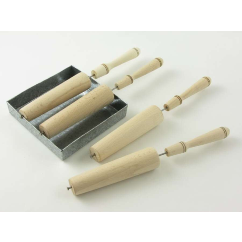 Kürtöskalács sütő szett - (5 részes) - Anyaga: fa + fém - Tartalmaz 4 db kürtöskalács sütőt + 1 db tepsit - A kürtöskalács sütő teljes hossza: 34,5 cm - A sütőhenger hossza: 16,3 cm - A sütőhenger átmérője az egyik végén: 29,5 mm - A sütőhenger átmérője a