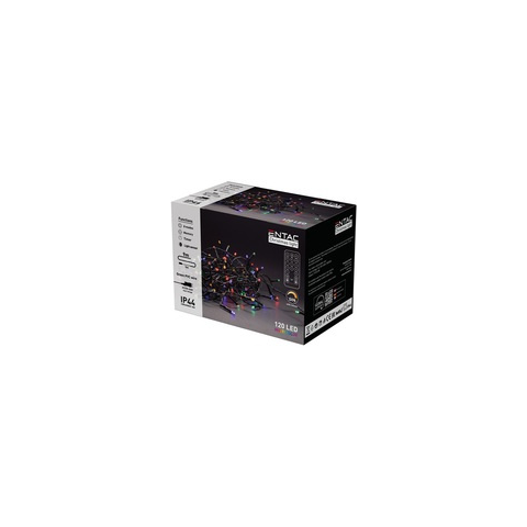 Entac Karácsonyi IP44 120 LED Füzér Színes 9m Távirányítóval – 3.6 W, IP44 védelem. Ideális ünnepi dekorációk, karácsonyfák és ablakok hangulatos megvilágítására. Ünnepi hangulatot teremt beltéren és kültéren is. Dekoratív fényhatás karácsonyfán, ablakban
