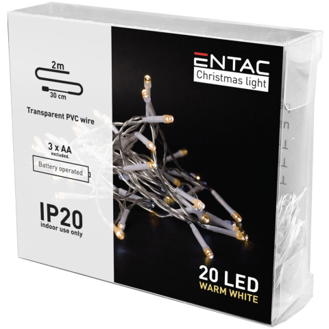 Entac Karácsonyi Beltéri Füzér 20 LED WW 2,3m (3AA nt.) – 0 W, IP20 védelem. Ideális ünnepi dekorációk, karácsonyfák és ablakok hangulatos megvilágítására. Ünnepi hangulatot teremt beltéren és kültéren is. Dekoratív fényhatás karácsonyfán, ablakban vagy e