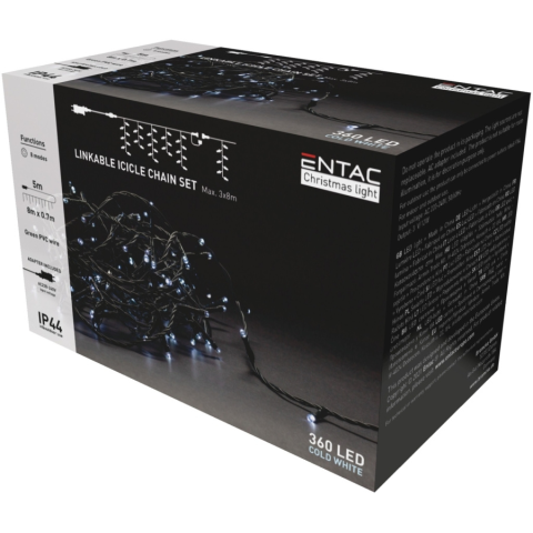 1 kép    Entac Karácsonyi IP44 360 LED sorolható jégcsapfüzér CW 8m szett adapterrel