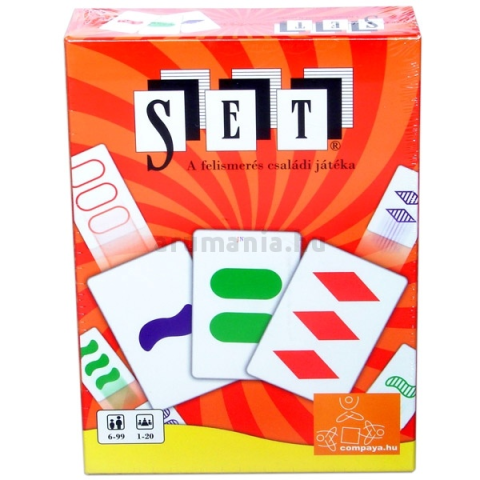 - Társasjáték típusa: Alapjáték, Egy igazán okos kártyajáték az egész család számára! A SET a kombinációs lehetőségek felismerése, a gyors helyzetfelismerés és még gyorsabb reakciók játéka. A játék célja, hogy a felcsapott lapokban SET-eket találjunk. Minden lapnak négy tulajdonsága van: színe (piros, zöld, lila), formája (ovális, hullámos, rombusz), száma (egy, kettő, három), tartalma (tömör, csíkos, üres). Egy SET három lapból áll, amelyben ez a négy tulajdonság külön-külön mind megegyezik, vagy eltér. De sose lehet két egyforma, és egy harmadik eltérő - mert az biztos nem SET! Készen állsz?