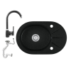 Laneo ZIA gránit mosogató szett fekete színben. Teljes készlet, ami tartalmazza a magasított csaptelepet, a beépített mosogatószer adagolót és a szifon készletet. Ovális kialakítású, egyedi megjelenésű mosogató, méretes, 44,5 x 37 cm-es medencével, ami 19