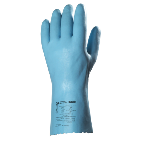 5206, 5207, 5208, 5209, 5210 • pamut anyagra mártott kék latex • sav-, lúg-, mikroorganizmus- és vegyszerállóság környezkímélő, bőrbarát, DMF mentes, vízbázisú módszerrel • 1,3 mm vastag, 30 cm hosszú, rugalmas • méret: 6, 7, 8, 9 és 10-es • csomagolás: 1