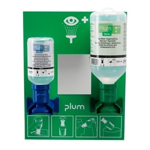 Fali szemkimosó állomás 1db 200ml pH Neutral + 1db 500ml Plum elsősegély szemkimosó folyadékkal. Tükörrel, útmutató képekkel és részletes leírással segíti az elsősegély nyújtást. Kimondottan olyan munkahelyekre ajánljuk, ahol vegyszeres és mechanikai szem