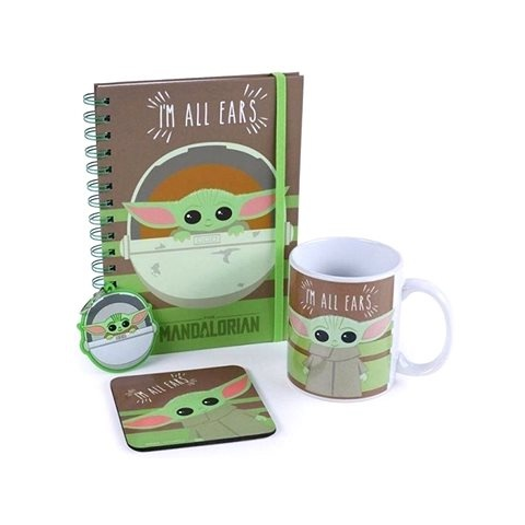 Ajándék szett - 1× bögre, 1× kulcstartó, 1× poháralátét, 1× A5-ös gyűrűs jegyzetfüzet gumiszalaggal, hivatalosan licencelt termék, dizájn: Star Wars: The Mandalorian, Baby Yoda Fans of the Star Wars film saga should not miss the Star Wars - The Mandalorian - All Ears gift set. The set belongs to the officially licensed products with the theme of The Mandalorian serie