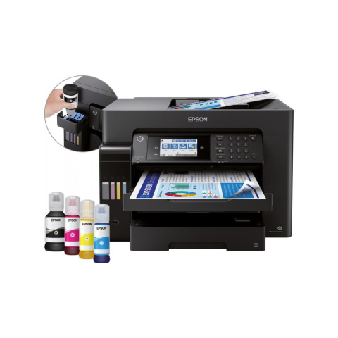 Epson EcoTank ET-16650. Nyomtatási technika: Tintasugaras, Nyomtatás: Színes nyomtatás, Maximális felbontás: 4800 x 1200 DPI, Nyomtatási sebesség (színes, normál minőség, A4/US Letter): 32 oldalak per perc. Másolás: Színes másolás. Szkennelés: Színes szkennelés, Beolvasás optikai felbontása: 1200 x 2400 DPI. Faxolás: Színes faxolás. Maximális ISO A-sorozatú papírméret: A3. Wi-Fi. Közvetlen nyomtatás. Termék színe: Fekete