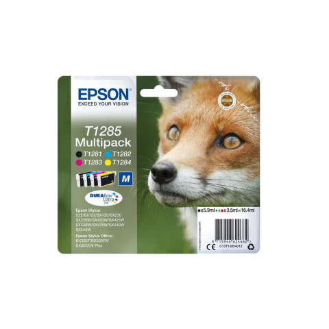 Epson Fox T1285. Fekete tinta mennyisége: 5,9 ml, Felszerelés típusa: Gyűjtőcsomag, Színes tinta mennyisége: 3,5 ml, Nyomtatási színek: Fekete, Cián, Magenta, Sárga, Mennyiség csomagonként: 1 db