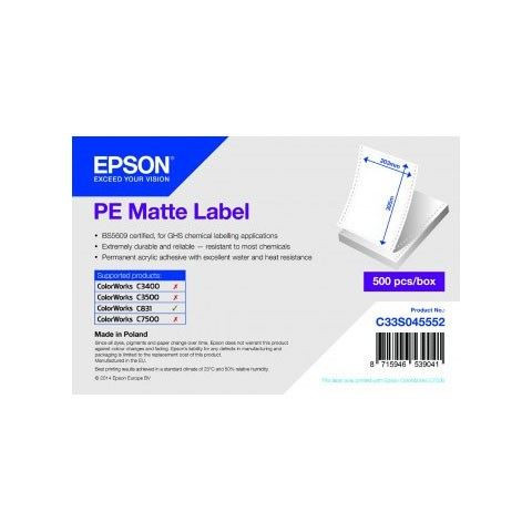 Fehér, matt, tintasugaras szintetikus címke, amely megfelel a GHS vegyszercímkékre vonatkozó BS 5609 szabványnak. Ezekkel a víznek, hőnek és a legtöbb vegyszernek egyaránt ellenálló, PE-alapú címkékkel pontos, beolvasható, elmosódásmentes színes nyomatokat hozhat létre. A vízbázisú akrilragasztó kiváló tapadást és UV-ellenállást biztosít, így hosszan tartó, megbízható, igény szerinti eredményeket nyújt.