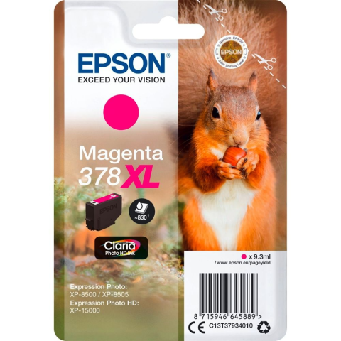 Epson Squirrel C13T37934010. Színes festék típusa: Pigment alapú tinta, Tintapatron kapacitás: Nagy (XL) kapacitású, Nyomtatási oldalszám színes tintapatronnal: 830 oldalak, Színes tinta mennyisége: 9,3 ml, Nyomtatási színek: Magenta, Mennyiség csomagonként: 1 db
