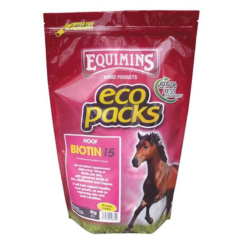 A Equimins Biotin 15 (15 mg / adag biotin tartalommal) termék 2020-ban megújult összetétellel kapható, így még több cinkkel és rézzel. A biotin az egészséges pata növekedéséhez szükséges kiegészítő, ezen kívül a bőr és szőrzet javulását is eredményezi. Cinket, metionint, rezet, MSM-t és kalciumot tartalmaz. A biotin tartalmú termékek etetése viszonylag hosszú ideig javasolt, hat-tíz hónap alatt érhet el jelentősebb változást a pata szerkezetében. Amen