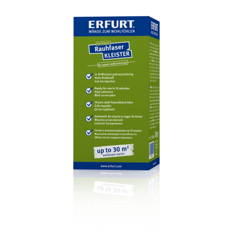 ERFURT Rauhfaser Fűrészporos- és papírtapéta ragasztó ERFURT Rauhfaser Fűrészporos- és papírtapétaragasztó, amely por alakú ragasztó, és vízben kell feloldani. Kimondottan a Rauhfaser tapétákhoz fejlesztették ki és alkalmas mindenfajta festhető vagy festést nem igénylő, könnyű- és középnehéz papírtapéta biztonságos ragasztására. Az ERFURT-Rauhfaser ragasztó tapétázáskor jó kezdeti tapadásával és a nagyon jó falon történő korrigálhatóságával tűn