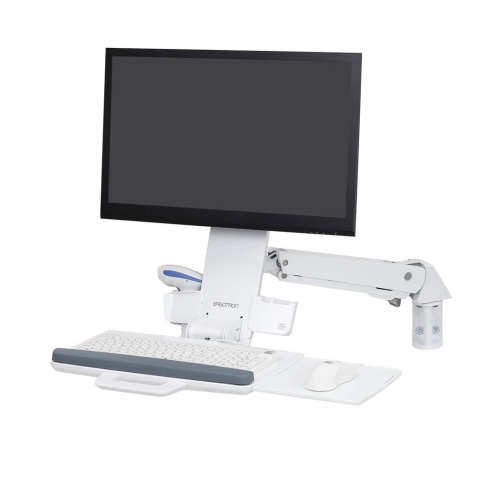 Dönthető, forgatható fali monitor állvány billentyűzet/egér és vonalód olvasó tartóval maximum 24" kijelzőkhöz elsősorban egészségügyi/orvosi munkaállomások kialakításához.