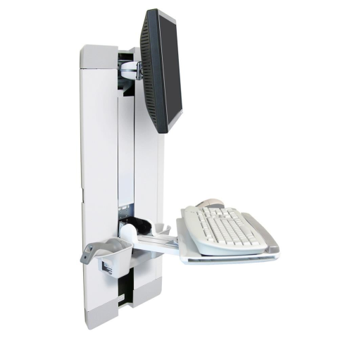 Ergotron fali állvány beteggondozási területre tervezve. Alkalmas egy 24"-os monitor, egy billentyűzet, egy egér és egy kézi terminál tárolására, kényelmes használatot biztosítva. - maximális ter...