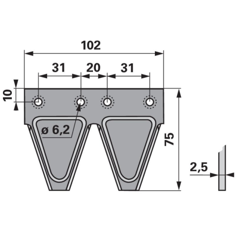 Gyári cikkszámok: 344.131, 344.1310, 344.1311 Kivitel: Carbodux Szélesség (B): 102 mm Magasság (H): 75 mm Furattáv (LA): 31 mm Furattáv 2 (LA2): 10 mm Furattáv 3 (LA3): 20 mm Lyukátmérő: 6,2 mm Süllyesztett szegecsfurat: alul Vastagság (S): 2,5 mm Gyár