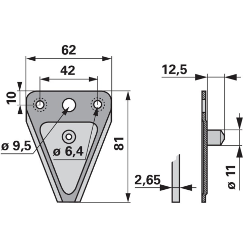Gyári cikkszámok: 210.3420, 5802 054 91, 267.1171 Kivitel: Carbodux, Bidux Szélesség (B): 62 mm Magasság (H): 81 mm Furattáv (LA): 42 mm Furattáv 2 (LA2): 10 mm Lyukátmérő: 6,4 mm Lyukátmérő 2: 9,5 mm Süllyesztett szegecsfurat: alul Vastagság (S): 2,65 mm