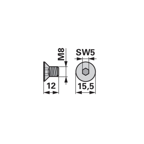Külső átmérő (D): 15,55 mm Menet (d): M8 Menettípus: Metrikus Hossz (L): 12 mm Kulcstávolság (SW): 5 mm Külső átmérő (D): 15,55 mm Menet (d): M8 Menettípus: Metrikus Hossz (L): 12 mm Kulcstávolság (SW): 5 mm