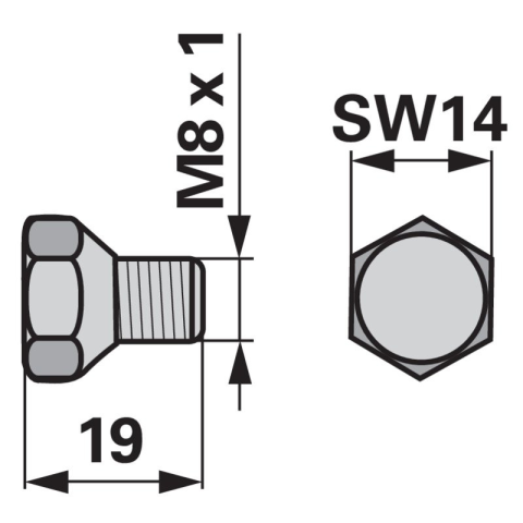 Menet (d): M8 x 1 Hossz (L): 19 mm Kulcstávolság (SW): 14 mm Menet (d): M8 x 1 Hossz (L): 19 mm Kulcstávolság (SW): 14 mm