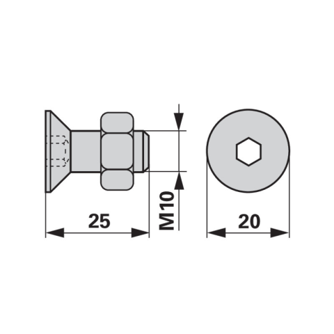 Külső átmérő (D): 20 mm Menet (d): M10 Menettípus: Metrikus Hossz (L): 25 mm Külső átmérő (D): 20 mm Menet (d): M10 Menettípus: Metrikus Hossz (L): 25 mm