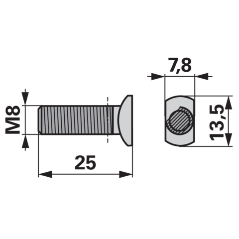 Szélesség (B): 13,5 mm Menet (d): M8 Hossz (L): 25 mm Vastagság (S): 7,8 mm Szélesség (B): 13,5 mm Menet (d): M8 Hossz (L): 25 mm Vastagság (S): 7,8 mm