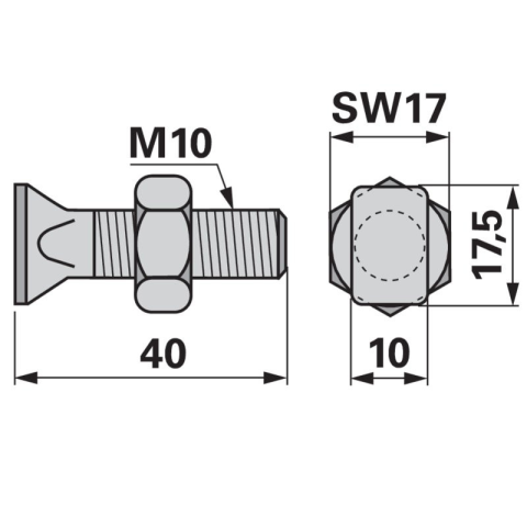 Szélesség (B): 10 mm Külső átmérő (D): 17,5 mm Menet (d): M10 Hossz (L): 40 mm Kulcstávolság (SW): 17 mm Szélesség (B): 10 mm Külső átmérő (D): 17,5 mm Menet (d): M10 Hossz (L): 40 mm Kulcstávolság (SW): 17 mm