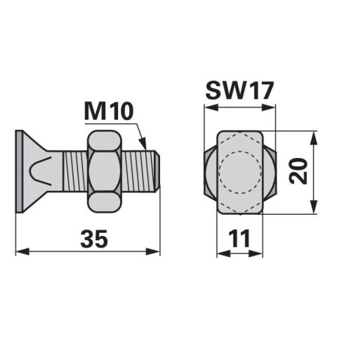 Szélesség (B): 11 mm Külső átmérő (D): 20 mm Menet (d): M10 Menettípus: Metrikus Hossz (L): 35 mm Felület: horganyzott Kulcstávolság (SW): 17 mm Szélesség (B): 11 mm Külső átmérő (D): 20 mm Menet (d): M10 Menettípus: Metrikus Hossz (L): 35 mm Felület: