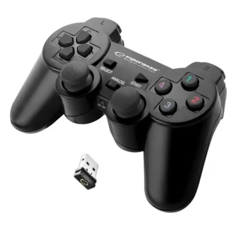 Functional wireless gamepad Esperanza GLADIATOR 2.4 GHz with vibrations for PC and PS3 consoles. Perfect for demanding and dynamic games as well as simpler ones. Its ergonomic shape makes holding the controller easier and prevents hand fatigue during