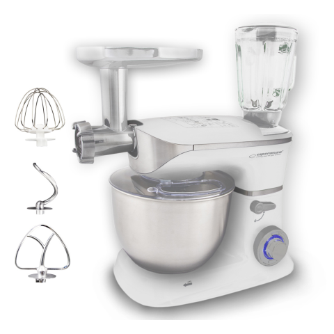Bolygós multifunkciós konyhagép 1000W – turmix és daráló funkcióval EKM025Professzionális, 1000 wattos teljesítményű bolygómixer, amely tökéletes választás minden modern konyhába. Erős motorjának, hatfokozatú sebességszabályozásának és számos tartozékának köszönhetően egyetlen készülékben ötvözi a dagasztó, keverő, habverő, húsdaráló és turmixgép funkciókat. Ideális sütéshez, főzéshez, valamint hús- és zöldségfeldolgozáshoz.Főbb jellemző