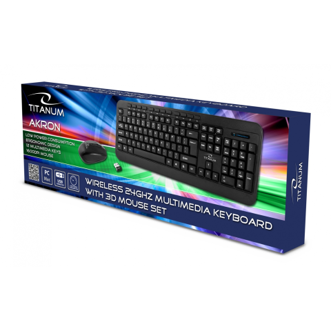 Esperanza Titanum TK109 AKRON 2.4GHz fekete angol vezeték nélküli billentyűzet + egérKényelmes, jó tapintású, legújabb generációs vezeték nélküli billentyűzet egérrel. A billentyűzet elegáns megjelenése és az egér modern alakja tökéletesen illeszkedik az asztalon más kiegészítőkkel. 12 multimédiás funkciógombot tartalmaz (számítógépem, könyvjelzők megjelenítése a böngészőben, e-mail, számológép, némítás, lejátszás leállítása / folytatása, e
