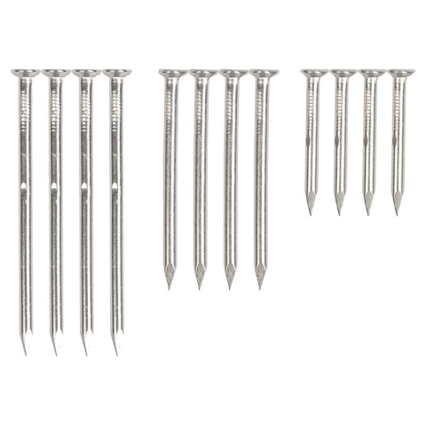 Fabarát alumínium szögek, 12 db-os kiszerelésben. Az alumínium szögek felhasználhatóak madáretetők és itatók, vagy más kellékek fára rögzítéséhez. Az alumínium nem károsítja a fát, mint a réz vagy a vas szögek. Anyagának köszönhetően az időjárás viszontag