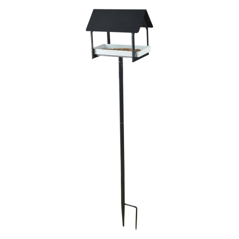 Letisztult stílusú, fekete-fehér leszúrható fém madáretető. Praktikus tető védi meg az eleséget az esőtől. Az egyre szárazabb nyarakon és zordabb teleken az állatok egyre kevesebb élelmet és vizet találnak, amin egy kis odafigyeléssen