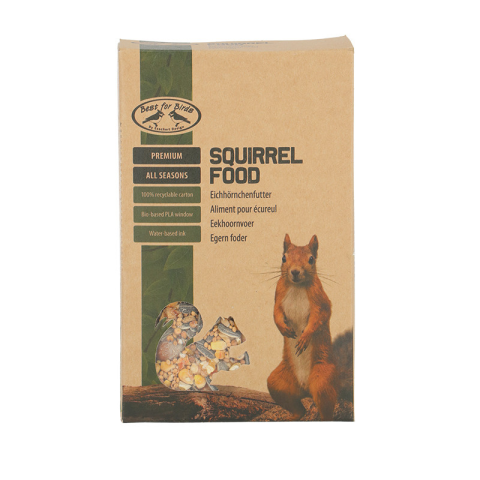 Mókus eleség vadonélő mókusok számára. Egész évben használható, olyan eleséget tartalmaz, amely a mókusok természetes táplálékát tökéletesen kiegészíti. Csomagolása újrahasznosítható papírdobozból és 100%-ban lebomló bio mű