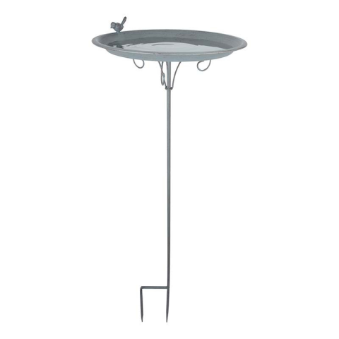 Lábakon álló, fém madáritató tál szürke színben, kismadár figurával az oldalán. Az itatás könnyebbséget és biztonságot jelent a környék madarainak, akik madárcsicsergéssel hálálják meg a gondoskodást. Nem csupán pompás kerti