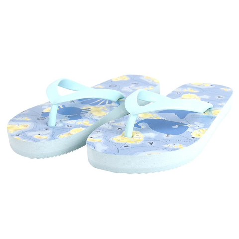 Tengerpart mintás flip-flop gyerekeknek 25-ös méretben. A flip-flop hátoldala alkalmas arra, hogy üzenetet hagyjunk a homokban. Anyaga: gumi.