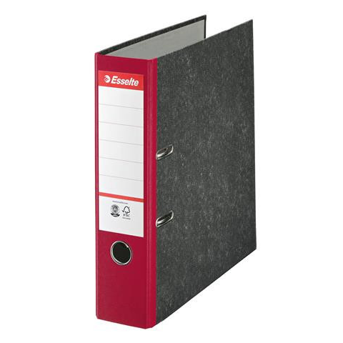 Iratrendező, 75 mm, A4, karton, márványos, ESSELTE, piros - színes gerincű iratrendező standard emelőkaros szerkezettel mindennapos használatra - kívül fekete, belül szürke papír borítás - ragasztott gerinccímke - borító rögzítő gyűrűk, kihúzólyuk és é