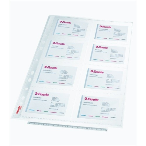 8 részes lefűzhető tasak névjegykártyák számára. Az univerzális lyukasztású lefűzőcsíknak köszönhetően bármilyen iratrendezőben, gyűrűskönyvben használható. 16 névjegykártya tárolásához. Víztiszta, 105 mikron vastag PP alapanyag. A 11 lefűzőlyuknak köszönhetően bármilyen iratrendezőben, gyűrűskönyvben használható. A4 mérethez.