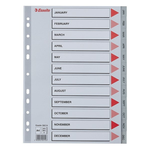 Regiszter ESSELTE A/4 műanyag Jan-Dec szürke Szürke színű regiszter. Nagyméretű téglalapok az előlapon a tartalom feltüntetésére. Megerősített lefűzőrész az előlapon Jan-Dec felirattal rendelkező regiszter fülek a dokumentumok gyors eléréséhez Hagyomán