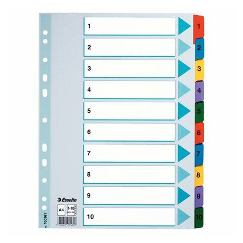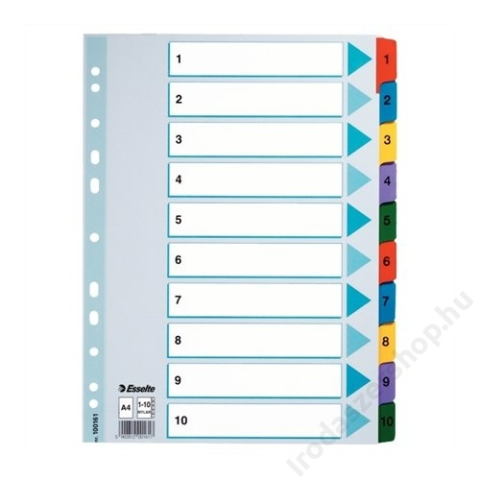 Regiszter, karton, A4, 1-10, ESSELTE Mylar (E100161) - tartós regiszter élénk színkombinációkban - nagyméretű téglalapok az előlapon a tartalom feltüntetésére - megerősített lefűzőrész az előlapon - erős, tartós, laminálással megerősített regiszter fü