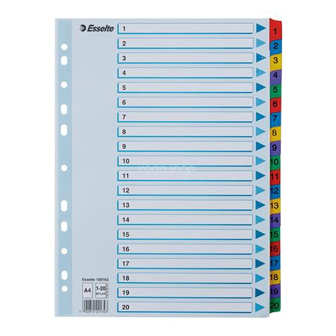 Regiszter, karton, A4, 1-20, ESSELTE Mylar - tartós regiszter élénk színkombinációkban - nagyméretű téglalapok az előlapon a tartalom feltüntetésére - megerősített lefűzőrész az előlapon - erős, tartós, laminálással megerősített regiszter fülek - hagy