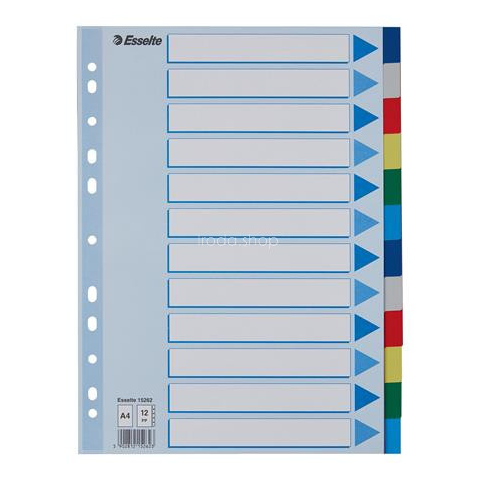 Regiszter, műanyag, A4, 12 részes, ESSELTE - elválasztólap visszafogott színkombinációkban - nagyméretű téglalapok az előlapon a tartalom feltüntetésére - 12 színes fül a könnyű rendszerezéshez - megerősített lefűzőrész az előlapon - hagyományos, 11-