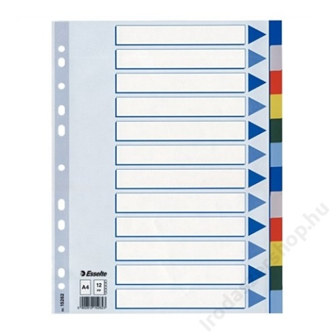 Regiszter, műanyag, A4, 12 részes, ESSELTE (E15262) - elválasztólap visszafogott színkombinációkban - nagyméretű téglalapok az előlapon a tartalom feltüntetésére - 12 színes fül a könnyű rendszerezéshez - megerősített lefűzőrész az előlapon - hagyomá