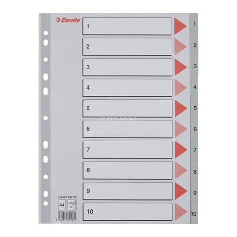 Regiszter, műanyag, A4, 1-10, ESSELTE,szürke - szürke színű regiszter - nagyméretű téglalapok az előlapon a tartalom feltüntetésére - 1-10 felirattal rendelkező regiszter fülek a dokumentumok gyors eléréséhez - megerősített lefűzőrész az előlapon - hag